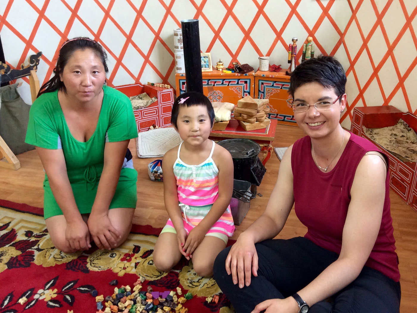 So erfahre ich, dass sich Munkhdelger schon sehr auf die Schule freut. Den restlichen Sommer wird sie bei ihren Großeltern in Ulaan Baatar verbringen. Sie liebt Pferde und Hunde. In der Spielecke des Zimmers erklärt sie mir dann die Einrichtung einer typischen Jurte. Wir spielen zusammen das „Knochenspiel“ und sie malt ein Bild von uns beiden.