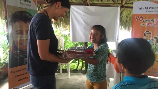 Ich war natürlich sehr gespannt, wie das erste Treffen wird. Im Vorfeld wurden wir darauf vorbereitet, dass die Erwartung nicht zu groß sein sollte. Aber in meinem Fall war es unbeschreiblich: Wir kamen um die Ecke, um den Raum zu betreten, in dem sich die Familie befand. Sobald Jeimmy mich entdeckt hatte, rannte sie auf mich zu und wir umarmten uns lange und innig. Ich musste meine Tränen vor lauter Emotionen zurückhalten. Uns wurden ihre zwei kleinen Brüder und ihre Mutter vorgestellt. Wir hatten ein paar Geschenke für Jeimmy, ihre Brüder und ihre Eltern dabei. Natürlich war die Freude darüber groß. Nachdem wir uns alle gefasst hatten, wurde uns eine DVD gezeigt. Der Film vermittelte uns einen Eindruck über Jeimmys Leben in El Tumbador. Danach haben wir zusammen gegessen. Das Essen wurde von den freundlichen Mitarbeitern von World Vision liebevoll hergerichtet.