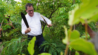 Da biegt ein Tross von zehn Autos um die Kurve. Die Frauen der Genossenschaft stimmen ein Willkommenslied an, Chief Chilu geht zum Wagen des Ministers und grüßt ihn freundlich. Müller ziert sich nicht lange, fragt nach Erfahrungen und Herausforderungen bei der Waldbewirtschaftung. Dann nimmt ihn Chilu an die Hand und in den Wald hinein. Der Chief und der Minister gehen zu einem Baum, der noch beschnitten werden muss. Chilu erklärt: „Hier sind viele schwache Seitentriebe. Die verzögern das Wachstum und müssen weg.“ Chilu hackt mit der Machete auf die dürren Äste ein. Dann stoppt er und fragt Gerd Müller: „Auch mal?“ Der zögert nicht, packt die Machete am zerflederten Plastikgriff und wenige Schläge später liegen die überflüssigen Äste auf dem Waldboden.