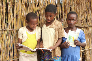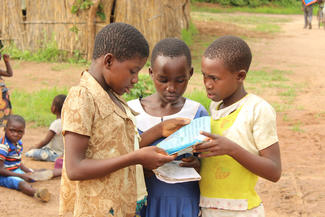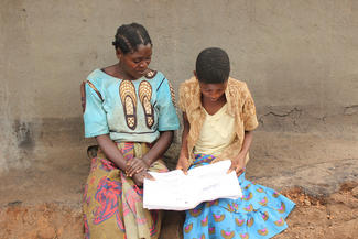 „Ich war glücklich, als Mutter mich bat, sie zu unterrichten", sagt Ndaziona lächelnd, während sie ein Buch durchblättert, das sie aus dem Fundus des Lesecamps ausgeliehen hat. Sie sucht nach einer passenden Geschichte, die sie mit ihrer Pflegemutter am Nachmittag lesen kann. Wie immer werden sie mit dem lauten Aufsagen von Vokalen und Silben anfangen. Memory möchte viele Wörter lernen, damit sie ihren Wortschatz erweitern kann.
