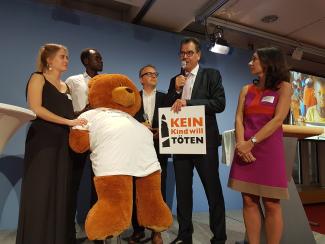 18.750 Mal Nein zum Einsatz von Kindersoldaten – es war ein klares Zeichen, das wir bei der Übergabe unserer Petition an Bundesminister Gerd Müller setzen konnten. So viele Menschen hatten die Erklärung unterzeichnet, mit der World Vision auch bessere Hilfen für ehemalige Kindersoldaten fordert. Und Minister Müller zeigte sich beeindruckt: „Ich nehme dieses Thema sehr ernst. World Vision und mein Ministerium sollten noch intensiver zum Wohle dieser Kinder zusammenarbeiten.“ Viele Gäste aus Politik und Zivilgesellschaft sind an diesem Abend in Berlin zusammengekommen, um bei der Petitionsübergabe dabei zu sein. Darunter auch Virginia Gamba, UN-Sonderbeauftragte für Kinder und bewaffnete Konflikte. Sie betonte, dass es nicht reiche, Kindersoldaten zu befreien: „Sie benötigen Hilfe bei der Rückkehr ins Leben. Bildung, Ausbildung, Chancen!“