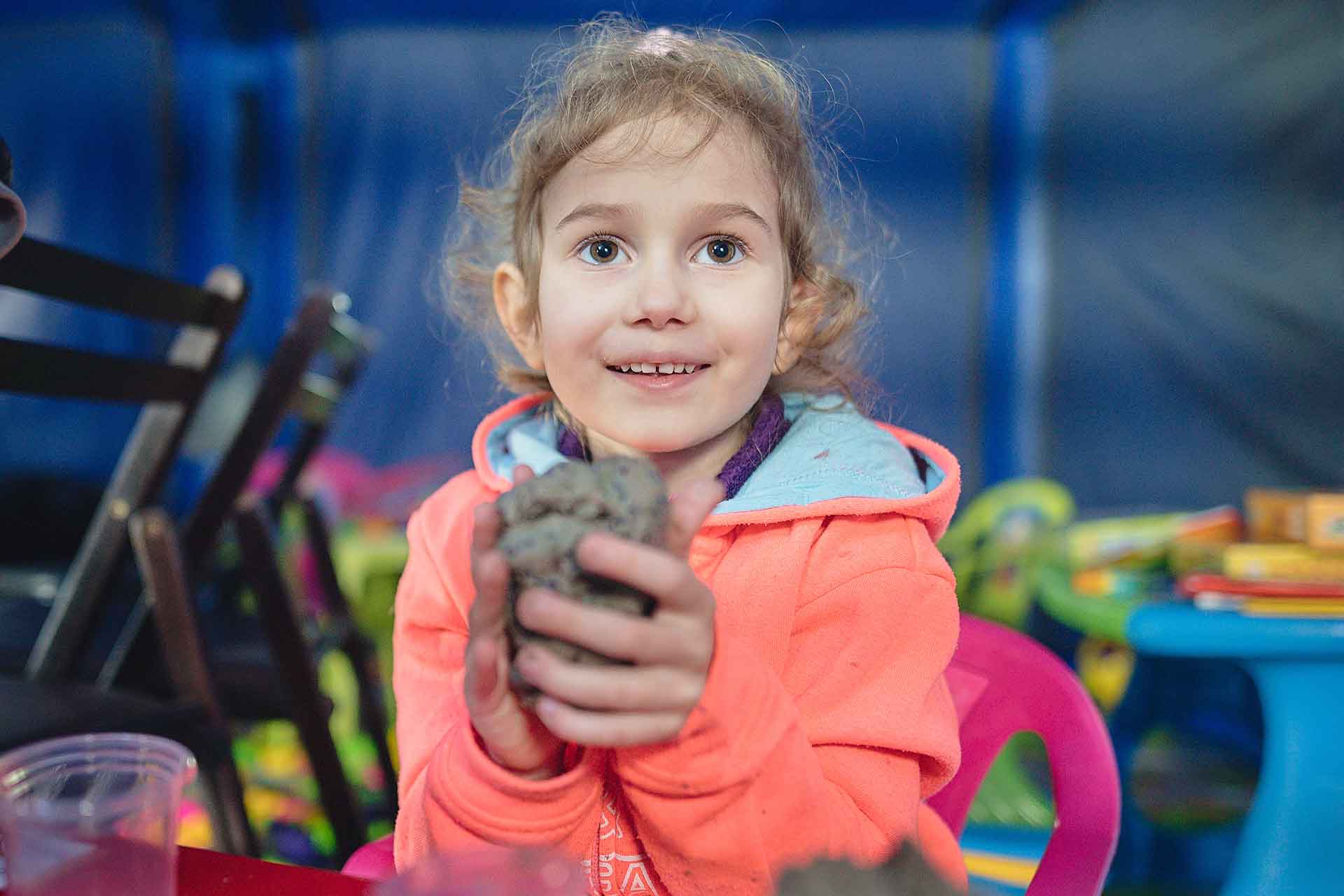 Wo möglich, gliedern wir ein Kinderschutzzentrum an eine bestehende Einrichtung an, zum Beispiel eine Gemeinschaftsunterkunft für geflüchtete Familien. Das hat für Eltern und Kinder große Vorteile, weil das Angebot ganz in der Nähe ist und die vorhandenen Strukturen genutzt werden können. Im Notfall kann es auch in einem Zelt untergebracht werden. Wichtig ist, dass die Kinder zur Ruhe kommen, sich entspannen können und Möglichkeiten haben ihre Gefühle auszudrücken. Beim Malen, Basteln, Kneten oder auch bei einem Spiel oder mit Musik geschieht dies oft spontan und auf natürliche Weise, aber im Kinderschutzzentrum stehen auch Fachkräfte oder geschulte Betreuerinnen oder Betreuer für Gespräche zur Verfügung. Wenn sie bei einem Kind Anzeichen für ein Trauma oder andere Probleme sehen, können sie die Eltern auch dabei unterstützen passende Hilfe zu bekommen.