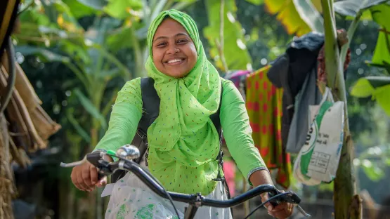 Während ihrer Schwangerschaft wurde Fatema oft von Rumana besucht, einer der Ernährungsberaterinnen von Nobo Jatra. Sie fährt mit einem rosafarbenen Fahrrad von Haus zu Haus und bringt schwangeren Frauen bei, wie sie für sich und ihr Babys sorgen können. Nach der Geburt besucht sie die Kinder weiter, um nach ihnen zu sehen und ihr Wachstum zu überwachen. „Ich liebe das, was ich tue“, sagt Rumana. „Ich tue alles aus tiefstem Herzen. Ich möchte diese Art von Arbeit fortsetzen. Wenn Nobo Jatra erweitert werden könnte, wäre das für uns und auch für andere Menschen hilfreich.“