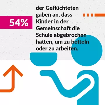 - Mehr als die Hälfte der Flüchtlingseltern bestätigt, dass nicht nur sie selbst, sondern auch ihre Nachbarn die Schulkosten nicht mehr bezahlen können oder dass Kinder die Schule abbrechen müssten, um zu betteln oder zu arbeiten.