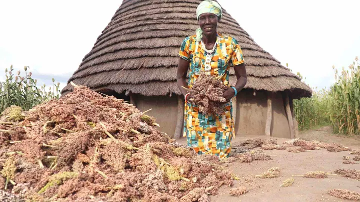 Dass Hilfe zur Selbsthilfe wirkt, zeigt das Beispiel von Akech, einer 45-jährigen Bäuerin in einem Rundhütten-Dorf nahe der Stadt Kuajok. Durch ein World Vision-Projekt erhielt sie landwirtschaftliche Schulungen, Werkzeuge und Saatgut. Heute kann sie ihre Familie gesund ernähren, einen Teil der Ernte auf dem Markt verkaufen und ihren Kindern davon die Schulbildung finanzieren.