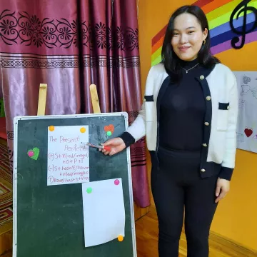 Nominsuvd war früher sehr schüchtern. Nachdem sie an den Aktivitäten des World Vision-Kinderklubs teilgenommen hat, hat sie sich völlig verändert. Sie wurde selbstbewusst und begann, sehr gut Englisch zu lernen. Heute ist sie 23 Jahre alt und studiert an der mongolischen Universität für Fremdsprachen. Sie engagiert sich gerne als Freiwillige, um Kindern Englisch beizubringen und humanitäre Arbeit für bedürftige Kinder zu leisten, und auf dem Bild erzählt sie Gleichaltrigen ihre Lebensgeschichte. Sie sagt: „Als Kind war ich sehr schüchtern. Ich hatte keine Freunde und fühlte mich die ganze Zeit einsam. Ich habe herausgefunden, dass wir uns nur durch Beteiligung entwickeln und verändern und unsere Lebenskompetenzen verbessern können. Ich liebe es, Kindern von meinem Leben zu berichten und ihnen Hoffnung auf eine bessere und erfolgreichere Zukunft zu geben. Mein Traum ist es nun, in den USA zu studieren, um eine berühmte Psychologin zu werden und Menschen zu helfen.“