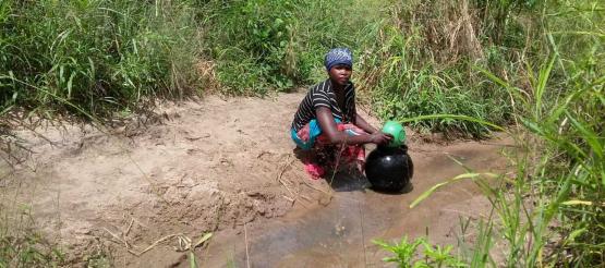 Albertina zeigt wie sie früher Wasser aus einem Bachlauf verschmutztes Wasser holen musste